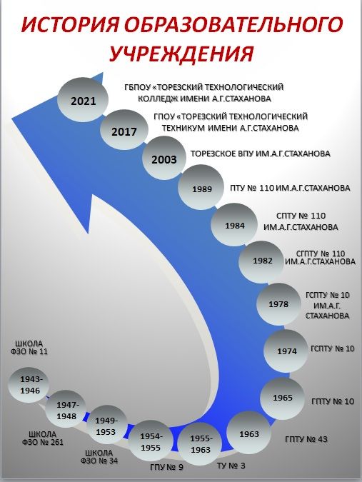 Сегодня это ГОСУДАРСТВЕННОЕ ПРОФЕССИОНАЛЬНОЕ БЮДЖЕТНОЕ ОБРАЗОВАТЕЛЬНОЕ УЧРЕЖДЕНИЕ "ТОРЕЗСКИЙ ТЕХНОЛОГИЧЕСКИЙ КОЛЛЕДЖ ИМЕНИ А.Г. СТАХАНОВА" (далее ГБПОУ "ТТК ИМЕНИ А.Г. СТАХАНОВА"), где обучаются студенты по 3 профессиям и 2 специальностям. Осуществляется общеобразовательная подготовка.